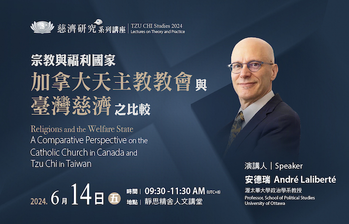 6月14日(五)他將透過加拿大天主教教會與臺灣慈濟基金會的對比,分析宗教慈善組織對於當地社會福利制度的影響,並見證近六十年來,證嚴上人以佛教帶領弟子為眾生付出的精神。