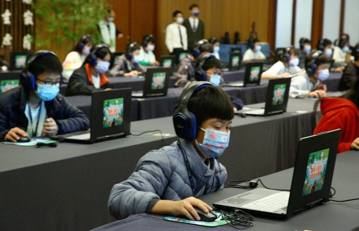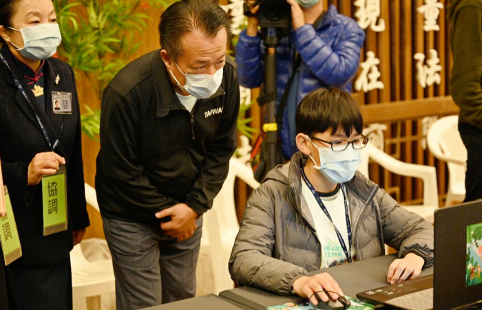 當小選手們開啟競賽的鑰匙後,小朋友們戴著耳機手握滑鼠,專心地看著螢幕,準備進入比賽。「現在倒數,五、四、三、二、一開始⋯⋯」現場靜悄悄地只聽到滑鼠移動的聲音,小朋友答題的速度超快,二十分鐘的競賽之盾,競爭相當激烈。