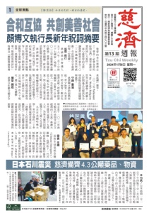 本刊採 FSC 認證標章用紙,為環境永續盡一分心力! 全球焦點 1 【靜思語】 今日的足跡,明日的歷史。 顏博文執行長新年祝詞摘要 敬愛的各位慈濟志 工、會員、社會各界的 好朋友們,還有慈濟志 業的同仁大家好: 衷心感恩您的支持, 讓慈濟慈善志業在二 ○ 二三年滿載成長與感 動,在此與您分享慈濟 的每一份榮耀。 感恩 前行 慈 濟 基 金 會 邁 入 五十八年,志工分佈 六十七國家 / 地區,二 ○ 二三亞太暨臺灣永續 行動獎,慈濟在環境教 育、慈善關懷、飲食生 活新創與成果得到肯定。 慈 濟 國 際 青 年 會 TIYA 出席 COP28 、紐 約氣候週、聯合國經 濟社會理事會青年論壇 等。也創立了創新的華 語教學平臺與線上遠距 教學,榮獲教育部青年 署﹁服務成效與評估﹂ 特優及﹁團隊籌建與傳 承延續﹂優等。 二 ○ 二三年 Parliament of the World's Religions 世界宗教議會,證嚴上 人於閉幕式以視訊為全 球面臨的問題表達關懷 與感恩。 守護 臺灣 慈濟關注濟助弱勢家 庭、青少教育、長者安 全、防災教育、數位化 慈善系統。經社會投資 報酬率︵ SROI ︶計算, 投入一元在靜思堂可創 造八點五倍的慈善能 量,投入環保志業可產 生六點三元的正面效益、 環保輔具更創造八十一 點一八倍的社會影響力, 也減輕受助者的經濟負 擔。而行動式環保教育 車在十五縣市中小學、 公共場域展出九十場 次,逾十萬人次體驗。 擴愛 國際 慈濟合作聯合國及全 球 NGO ,二 ○ 二三年海 外賑災的扶困受益人次 超過四十五萬,臺灣大 米外援受益逾七十九萬 人次,為烽火難民的援 助逾五十八萬人次受惠。 九月在美國哈佛大 學,來自全球的三十多 位跨領域學者專家 以 ﹁證嚴上人的思想與實 踐研究﹂為主題發表論 述研究,此為慈濟在全 球最高學府研討創辦人 證嚴法師哲思與領導的 創舉。 當責 永續 面對全球氣候急難 ︵ Climate Emergency ︶ 嚴峻,我們和下一代共 同肩負氣候災難的後果 及人類永續的契機,慈 濟基金會強化治理、跨 域數位、賦能傳承、防 災推素、淨零永續,有 您支持步步更踏實,在 新的一年,我們需要 您,並歡迎更多伙伴加 入支持。 (全文請見慈 濟全球資訊網 https:// tw.tzuchi.org/ ) 本刊訊 / 日本時 日下午四 能登半島發 六強震,造成輪 棟建物延燒、災區 根據NHK四日下午十 導,確認目前為止,石川 內有八十四人因這起地震死 亡,受傷人數超過三百人。 證嚴上人得知訊息後, 與日本慈濟志工進行視訊連 線,上人請志工掌握當地災 區需求的相關訊息,以便能 夠給予切實的援助,同時也 請志工務必等到當地交通恢 復再前往勘災。慈濟基金會 也在一月一日晚間備齊四點 三公噸的物資及藥品,包含 毛毯、香積飯、即食飯條等; 與此同時,臺北慈濟醫院也 準備八十人次,可使用十四 天數量的藥品總計二十四 箱。一旦可以前往,即可啟 動援助。 (文:慈濟基金會) 日本石川震災 慈濟備齊 公噸藥品、物資 合和互協 共創美善社會 4.3 ▲ 慈濟基金會執行長顏博文(後排左三) 鼓勵青年參與公益,此為第七屆入選的公 益實踐計畫團隊。 (圖:慈濟基金會) 服務專線:03-8266779 分機 352、394 慈濟週報 ▲ 日本石川地震發生後,慈濟志工 快速動員備齊救援物資,總計四點 三公噸的物資與藥品隨時準備援 助。 (圖:慈濟基金會)
