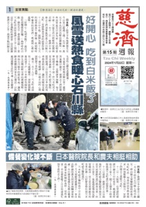 本刊採 FSC 認證標章用紙,為環境永續盡一分心力! 全球焦點 1 【靜思語】 今日的足跡,明日的歷史。 ▲為了確保米粒煮熟,大鍋煮飯加燜至少要四十分鐘, 煮好的米飯還要放入保溫桶才不會冷掉。 (圖:慈濟日本分會) 風雪送熱食 日本訊 / 能登半島地震發生至 今以來已超過三週,石川縣一萬 五千多名居民仍暫居避難所,有 些民眾甚至以車為家,生活相當 不便,災區生活只能暫時從簡與 忍耐。一月十二日,慈濟日本分 會志工們頂著風雪進入石川縣穴 水町,安排熱食烹煮的前置作業; 十三日中午起,展開為期十七天 的現煮熱食午餐供應 收到暖呼 呼餐食的民眾們,都感到心裡好 溫暖。 ﹁好開心,吃到米飯了 最近不 是吃泡麵就是拉麵。﹂熱呼呼的白 飯、綠色毛豆、番茄燴豆腐⋯⋯當 穴水町居民從慈濟志工手上領到 這份心意滿點的熱便當,居民感謝 慈濟志工之外,渴望早點回歸日常 生活的心願也表露無遺。 災區何時能夠回歸日常?儘管 答案難以確定,慈濟志工們把握 當下機緣,克服諸多困難,每天 準時趕在中午前,於穴水町冥王 星交流會館、穴水町綜合醫院, 提供超過三百份至五百多份的現 煮熱食給民眾,讓居民暖胃並暖 心,養足精神,以最正向的心情 面對接下來的挑戰。 截至一月十八日,穴水町尚設 有三十九處避難所,房屋毀損數 量高達千戶。日本政府也開始安 排生活機能較完善的避難地點, 例如石川縣外的旅社等地,讓高 齡者與體弱民眾先行遷居,以防 範因避難生活的不適,危及健康。 (文:慈濟基金會) 日本訊 / 慈濟日 一月五日 災,經由陳 水町町長,知悉 求。即刻整備人力 了四梯志工進駐穴水町 十二日,大阪第一位受證 濟日籍志工中村省吾,載運食 和志工家人,開了五個多小時車 程抵達穴水町進行前置作業。 十三日清晨,慈濟志工兵分兩 地於穴水町綜合醫院廚房與冥王 星交流會館外進行熱食烹煮。但 十五日當天,氣溫過低導致瓦斯 管線結冰,冥王星交流會館外的 烹煮任務,只好緊急移位到穴水 町綜合醫院進行。 穴水町綜合醫院島中公志院 長,天天到廚房感謝志工,來自 長野縣的農夫則送來兩輛貨車時 蔬,石川縣當地農夫也親自載著 高麗菜來給補給食材。這些善 意,在在都慰暖了日日從清晨忙 到半夜的志工們。 (文:慈濟基金會) 備餐變化球不斷 日本醫院院長和農夫相挺相助 好開心 開 吃到白米飯 ▲ 穴水町居民與醫院工作人員都排隊前來領取 午餐熱食。 (圖:慈濟日本分會) ▲ 風雪中,慈濟志工合力為穴水町送上熱騰騰 的餐食。 (圖:慈濟日本分會) 服務專線:03-8266779 分機 352、394 慈濟週報