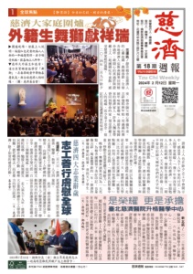 Tzu Chi Weekiy 2024 年 2 月 12 日 星期一 嚴 證 釋 │ 人 行 發 譽 榮 文 博 顏 │ 人 行 發 處 史 文 │ 輯 編 會 金 基 業 事 善 慈 濟 慈 教 佛 : 行 發 號 三 〇 七 段 三 路 央 中 市 蓮 花 : 址 地 國 內 郵資已付 花蓮郵局許可證 花蓮字第 149 號 無法投遞免退回 電子報訂閱 QRcode 第 18 期 週 報 本刊採 FSC 認證標章用紙,為環境永續盡一分心力! 服務專線:03-8266779 分機 542、547 慈濟週報 甲辰年春節特刊 1 慈濟大家庭圍爐 外籍生舞獅獻祥瑞 球 全 慰 膚 行 善 工 志 是榮耀 更是承擔 臺北慈濟醫院升格醫學中心 歲 辭 業 志 大 四 濟 慈 / 訊 蓮 花 濟 慈 , 日 六 月 二 四 文 人 、 育 教 、 療 醫 、 善 慈 思 靜 聚 齊 工 志 及 仁 同 業 志 大 拜 歲 辭 人 上 嚴 證 向 , 舍 精 。 來 未 望 展 去 過 點 盤 , 年 文 博 顏 長 行 執 會 金 基 濟 慈 百 一 助 已 球 全 在 濟 慈 , 享 分 饋 回 從 , 區 地 家 國 個 三 十 三 災 震 地 敘 土 援 馳 、 鄉 故 陀 佛 裡 哪 。 動 行 等 洲 非 轉 翻 到 民 臺 在 而 。 去 裡 哪 往 就 , 難 有 , 動 行 善 慈 的 常 如 了 除 , 灣 善 慈 升 提 , 源 資 界 各 結 連 更 。 能 量 在 , 驗 經 濟 慈 由 藉 , 外 此 , 享 分 座 講 壇 論 或 刊 期 際 國 帶 , 念 理 濟 慈 解 了 人 多 更 讓 本 是 也 ; 力 響 影 的 外 內 海 動 之 織 組 事 理 會 議 教 宗 界 世 屆 。 一 四 濟 慈 , 年 九 十 五 第 入 走 的 領 帶 人 上 往 續 持 將 業 志 大 。 進 前 力 努 向 方 濟 慈 : 文 ︵ ︶ 會 金 基 / 訊 蓮 花 人 濟 慈 是 舍 精 思 靜 球 全 , 節 春 曆 農 。 鄉 故 靈 心 的 精 到 回 巢 歸 燕 舊 似 人 濟 慈 地 各 證 與 於 過 莫 的 心 開 最 , 年 過 舍 感 , 飯 夜 年 吃 圓 團 起 一 人 上 嚴 。 暖 溫 的 庭 家 濟 慈 受 夕 除 日 九 月 二 年 四 二 ○ 二 、 菜 年 備 準 心 精 父 師 舍 精 , 夜 傳 的 滿 滿 用 , 糕 年 與 糕 發 祥 吉 歸 地 各 接 迎 , 味 鄉 家 與 味 年 統 帶 家 攜 人 多 許 。 人 家 濟 慈 的 來 上 嚴 證 受 領 , 家 的 命 慧 到 回 眷 惦 、 念 思 子 弟 令 而 , 福 祝 的 人 。 道 味 的 家 的 濃 濃 這 是 正 的 記 示 開 會 早 工 志 夕 除 在 也 人 上 嚴 證 為 , 出 付 的 來 年 八 十 五 人 眾 恩 感 , 中 麼 這 有 沒 來 年 十 幾 ﹁ , 暖 溫 來 帶 間 人 勉 殷 並 ﹂ 。 濟 慈 的 天 今 有 沒 就 , 人 多 期 ﹁ , 值 價 命 生 揮 發 , 福 祝 我 自 人 人 且 而 , 緣 好 結 人 與 天 天 , 人 人 們 我 待 做 叫 字 名 的 們 你 呼 稱 父 師 記 忘 要 不 ﹂ 。 ﹄ 薩 菩 ﹃ 位 幾 。 動 活 會 晚 有 還 , 飯 圓 團 過 吃 鼓 密 鑼 緊 來 日 連 , 生 籍 外 和 學 同 青 慈 與 , 氛 氣 慶 喜 動 帶 能 望 希 , 獅 舞 習 學 。 緣 好 結 人 濟 慈 球 全 簡 很 獅 舞 為 以 原 , 生 籍 外 位 兩 中 其 光 , 戰 挑 滿 充 程 過 習 學 到 想 沒 卻 , 單 學 大 技 科 濟 慈 , 天 三 了 練 就 場 出 走 是 有 覺 感 ﹁ : 說 謙 奕 史 生 籍 外 克 比 三 莫 ﹂ 。 難 麼 那 有 沒 就 習 學 心 用 但 , 難 點 中 像 想 我 比 頭 獅 ﹁ : 說 也 達 尚 蔡 青 慈 ﹂ 。 力 耐 與 力 體 要 需 很 中 動 移 , 重 亮 大 一 為 成 然 果 演 表 獅 舞 , 中 會 晚 象 也 , 記 印 好 美 下 留 圓 團 舍 精 為 , 點 持 濟 慈 , 年 一 的 新 罩 籠 象 瑞 、 祥 吉 徵 。 生 眾 下 天 庇 普 , 量 能 的 愛 揮 發 續 ︶ 馨 亞 吳 、 和 清 張 、 萱 嘉 洪 : 文 ︵ / 訊 北 新 濟 慈 北 臺 年 三 一 〇 二 , 鑑 評 心 中 學 醫 加 參 次 一 第 院 醫 中 學 醫 準 ﹁ 為 成 年 六 一 〇 二 學 醫 受 接 次 再 年 三 二 〇 二 , ﹂ 心 一 員 委 得 獲 現 表 體 整 , 鑑 評 心 中 。 心 中 學 醫 升 榮 , 定 肯 致 心 常 平 以 院 慈 北 臺 , 鑑 評 對 面 鑑 評 讓 實 如 , 準 水 業 作 常 日 現 展 的 景 願 與 旨 宗 務 服 院 醫 解 了 員 委 三 宕 延 情 疫 因 鑑 評 便 即 。 踐 實 醫 進 精 心 用 仍 仁 同 院 醫 間 其 , 年 過 通 次 此 為 , 命 生 救 搶 , 質 品 療 。 點 亮 要 重 的 鑑 評 界 醫 的 灣 臺 , 示 表 長 院 誠 有 趙 有 必 勢 心 中 學 醫 為 成 , 出 傑 常 非 好 更 求 追 自 來 是 力 壓 這 而 , 力 壓 更 有 們 我 對 家 大 為 因 正 ; 療 醫 的 精 續 持 須 必 們 我 以 所 , 待 期 的 高 。 隊 團 入 加 才 人 秀 優 多 更 引 吸 , 進 及 以 , 院 醫 濟 慈 立 創 人 上 嚴 證 恩 感 長 院 趙 將 院 醫 濟 慈 北 臺 , 來 未 , 出 付 的 仁 同 位 一 每 人 病 、 質 品 療 醫 把 , 進 精 加 更 上 礎 基 有 現 在 。 務 服 療 醫 的 越 卓 更 供 提 , 好 更 到 做 全 安 ︶ 曦 冉 鄭 、 晴 唯 廖 : 文 ︵ 圍爐現場,證嚴上人說 明,福慧紅包是要祝福人人 新的一年福慧雙修。弟子領 受祝福,歡喜向上人拜年。 慈科大外籍生和慈青, 連日來緊鑼密鼓學習「舞 獅」,在春節晚會中帶動喜 慶氣氛,與全球慈濟人結好 緣。(圖:慈濟基金會) 2023年7月19日,顏執行長(右)與土耳其慈濟志工 一起為利亞難民照顧戶送上物資卡。 (圖:慈濟基金會)