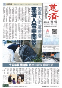 本刊採 FSC 認證標章用紙,為環境永續盡一分心力! 全球焦點 1 【靜思語】 不要小看自己,因為人有無限的可能。 慈濟人雪 加拿大訊 / 距離慈濟加拿大西 多倫多聯絡處七十公里的安省貴 湖市︵ Guelph ︶,一群街友搭帳 篷為居,當地冬季低溫會降到零 下二十度,酷寒讓街友特別難熬。 但即便有庇護所供暫時避難,不 少街友礙於入住條件與交通問題, 寧願選擇睡在雪地裡的帳篷。 來自加拿大東岸紐芬蘭的馬修, 是其中一名 友。他擁有機械專 業,在安省買房、結婚生子,幾 年前因車禍受傷後就無法如常工 作,導致房貸積欠,只好賣掉房 子,最後也結束婚姻關係。雪地 帳篷街友的故事,比起馬修遭遇 更辛苦的恐怕還更多。 慈濟加拿大西多倫多聯絡處受 證志工楊桂格︵ Gregg Young ︶是 安省地區的社工,今年入冬最酷 寒時,他帶著慈濟志工前往關懷 這些住在帳篷裡的街友,見到的 情景讓人難過。帳篷外堆放行李 及散落的衣物 一名街友為了取 暖,在帳篷用瓦斯,結果把帳篷 給燒了。另一處緊閉的黑 無 人回應,但儘管擔心裡面街友是 否已因凍寒而往生,志工也不能 隨意將帳篷打開。 馬修告訴慈濟志工方思茜,近年 帳篷街友人數已翻了好幾倍,除了 貴湖市區,其他區域也不在少數, 有些帳篷街友會選擇遷往林地裡落 腳。 ﹁這麼冷的雪地,如何入睡?﹂ 慈濟志工萬般不捨,但盡其所能地 將毛毯、襪子、暖暖包、盥洗用品 放進桶子裡,連同熱咖啡致送,希 望能給寒冬中的街友們一點溫暖。 (文:加拿大慈濟加東分會) 美國 / 舊金 有一處冬 在內的幾個 在此為街友提供 濟舊金山志工團隊 食料理,為街友們帶來 滋味。 除了固定提供熱食,團隊每 定期於聖瑪麗大教堂為街友舉行 令發放。一位長達十五年,前來領 取物資的西班牙裔街友,去年耶誕 節前找到了清潔工的工作,他告訴 長年協助他的慈濟志工林育貞 他 已脫離街友生活,志工聽他再見時, 說了一句﹁我要回家了﹂,心中感 動不已。林育貞說,當二 ○ 二二年 在發放現場沒見到他時,心中很是 牽掛,於今見到他如此健康地生活, 感到無比安慰。 慈濟志工為街友供應熱食,也見 到了許多困難的人生處境,一名才 二十九歲的哥倫比亞年輕人,徒步離 開自己的國家,花了兩個月的時間 才來到美國,最後落腳 舊金山。慈 濟志工特別 關懷他,並準 備為他慶祝 隔月的生日。 但生日當天, 當慈濟志工 準備好蛋糕 為他慶生時, 他卻再也沒 有出現了,志 工也只能在 心中為他祝 福。 (文:張今 寶、林育貞) 十五年長情陪伴 舊金山街友重回生活 加拿大街友 ▲ 近年加拿大安省貴湖市雪地帳篷街友人數已 經愈來愈多。 (攝影:洪友仁) ▲ 聽不到雪地裡的帳篷回應,儘管擔心裡面街 友的狀況,也不能任意打開帳篷關心。 (攝影:洪友仁) 服務專線:03-8266779 分機 542、547 慈濟週報 ▲ 西班牙裔 街友(右一) 找到了清潔 工作,與慈濟 志工歡喜重 逢。 (攝影:林育 貞)