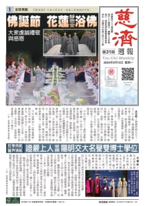 本刊採 FSC 認證標章用紙,為環境永續盡一分心力! 全球焦點 1 【靜思語】 不要小看自己,因為人有無限的可能。 服務專線:03-8266779 分機 542、547 慈濟週報 花 蓮 為表達對 嚴上人行誼 及其倡導人 心淨化、尊重 生命之具體 貢獻的尊崇 與感恩,國立 陽明交通大 學於五月十二 日上午頒予 證嚴上人名 譽哲學暨醫 學雙博士學 位,慈濟四大 志業體主管 同仁及志工們也共同分享這分榮耀。 頒授典禮在花蓮浴佛大典結束後於靜 思堂講經堂舉行,由陽明交通大學林奇 宏校長頒贈名譽博士學位證書授予證嚴 上人,林奇宏校長宣讀表彰辭,感念 嚴上人於全球各地致力推動 善、醫療、 教育、人文四大志業,對淨化人心、環 保科技、醫療創新等作出巨大貢獻。而 上人則將這分殊榮,歸功於志業體同仁 與全球慈濟人的付出 並感恩陽明交通 大學對慈濟人的鼓勵。 上人表示,慈濟近一甲子走來,都是 靠著人與人之間的清淨本性與無私大 愛,點滴累積善業。上人有感於當前資 訊大量流通,人們的意念愈來愈複雜 社會應有共同方向,讓人 有愛心,走 入人間行善,對未來都有希望。 陽明交通大學林奇宏校長宣讀名譽博 士表彰辭時強調,上人將佛教的慈悲喜 捨與現代社會的需求相結合 讓佛教教 義更貼近現代人生活,這種善與愛的循 環樹立起當代文明新典範。 (文:慈濟基金會文史處) 佛誕節 花蓮 浴佛 本刊訊 臺灣時 日上午七點 全球十四個國 濟會所,與花蓮 上浴佛,共度佛誕節 全球慈 日。 一大早,花蓮靜思堂道侶廣 場上,微風徐徐,陽光溫煦, ︿大地和風﹀的樂聲響起,靜 思精舍師父、四大志業體主管 同仁、貴賓、警消代表、急難 救助隊,以及慈濟志工與民眾 超過二千五百人,在證嚴上人 的帶領下,為慈濟全球浴佛揭 開序幕。 今年已經八十三歲的基隆志 工陳本屾,早在四月三日花蓮 發生強震之前,就已回到靜思 精舍出勤務,這是他第一次參加 花蓮場浴佛。他祈願人人平安、 社會祥和,並自許照顧好自己 的健康,才能繼續幫助別人。 來自非洲辛巴威的李若娜是 慈濟大學二年級的外籍生,這 是她第一次參加浴佛活動,感 到很開心。聽上人開示說三節 合一就 感念佛恩,感謝父母 恩,感謝眾生恩,她從中學到 要尊敬父母,以後對人也要慷 慨一點。 今年浴佛加入︽無量義經 ・ 德行品︾梵唄,浴佛意義殊勝 非凡。經中有云:﹁智恬情泊 慮凝靜 意滅識亡心亦寂。﹂浴 佛滌除煩惱無明,祈願眾人善 念匯聚,弘法利生,社會祥和, 素食護生,天下無災。 (文:慈濟基金會文史處) 大眾虔誠禮敬 與感恩 靜思堂 哲學典範 醫界領航 證嚴上人 陽明交大名譽雙博士學位 受 頒 ▲ 證嚴上人 陽明交通大 的腳步將穩健 (圖:慈濟基金會 ▲花蓮浴佛大典,慈濟創辦人證嚴上人親臨現場帶領浴佛。(圖:慈濟基金會)
