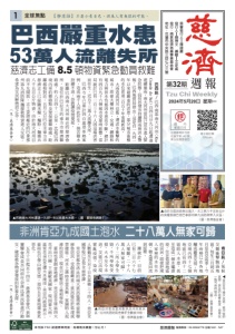 本刊採 FSC 認證標章用紙,為環境永續盡一分心力! 全球焦點 1 【靜思語】 不要小看自己,因為人有無限的可能。 服務專線:03-8266779 分機 542、547 慈濟週報 慈濟志工備 8.5 頓物資緊急動員救難 巴西嚴重水患 萬人流離失所 巴西訊/ 巴西南部南大河州︵ Rio Grande do Sul ︶自四月廿九日起遭逢 連續暴雨,南大河州當局已宣布進入緊 急狀態,向居民發布持續降雨與洪水警 報。巴西地質局指出,這是自一九四一 年以來最嚴重的洪患,部分城市蓄積 的水位更達一百五十年來最新高。 大雨造成河川氾濫,遭洪水衝擊的 城市,即便大樓林立,交通、網路和 電力與供水也都因水患而中斷。總計 有四百九十六個城市受豪雨影響,當 局統計已有一百三十六人因這場洪害 而往生,近五十三萬人流離失所。 巴西今年已累計四百萬登革熱案 例,造成兩千人因此往生,倘若積 持續不退,恐將讓疫情蔓延。 距離巴西南大河州最近的慈濟會 所,是位於巴拉圭的東方市慈濟聯 絡處 約八百四十二公里,比起巴西 境內里約聯絡點及聖保羅聯絡處,距 離都相對近。五月七日巴拉圭東方市 慈濟志工已採購米糧、麵粉、麵條共 八千五百公斤物資,由於南大河州目 前不允開放,志工委請鄰近的巴拿那 州第九消防隊攜援救 進入災區, 希望為災民解燃眉之急。 (文:慈濟基金會) 肯亞 氣候 災難衝擊 區。每年三 月是肯亞雨季, 年雨勢已在各地 釀成嚴重災情。肯 亞境內四十七個 地區已有四 二 區陷入水患,甚 至造成一個水壩潰 堤。住在低窪地區 的居民,即便把淹 入家裡的水往外 倒,積水還是回流 到屋裡。 據統計,目前 已有二百六十七 人罹難、二十八 萬人無家可歸、 六十二所小學全 毀、千所學校受 損。大水至今未 退,災區已出現 霍亂疫情,染疫 人數截至五月十日共累積三十四人,肯亞全 國學校已宣布全面停課。 肯亞首都奈洛比的兩大貧民區瑪塔雷與穆 庫魯居民,受創最嚴重;貧民區位於低漥或 禁建區,河水上漲時首當其衝。家園陷入泥 濘的居民,現在只能暫居工地和學校。 豪雨也重創當地經濟,肯亞是全球第四大 花卉出口國,主銷歐美國家,現因豪大雨, 溫室花朵也全遭大水淹沒。肯亞內政部表示, 豪雨也引發山崩災情,預估五月豪雨還會更 惡化。 五月十日起至十四日,慈濟基金會代表與 靈醫會成員共同前往奈落比貧民區進行勘 災,確認救急物資發放的對象名冊。 (文:慈濟基金會) 非洲肯亞九成國土泡水 二十八萬人無家可歸 ▲巴西南大河州遭遇一九四一年以來最大水患。(圖:翻拍自網路) ▲ 肯亞至 家園,居民 一點可用的物 (圖:慈濟基金 ▲ 由於災區目前無法進入,志工將八千五百公斤 的食糧委請巴西巴拿那州第九消防隊帶入災區。 (圖:慈濟基金會) ▲ 肯亞洪害首當其衝殃及河岸貧民 區,沿河而居的房舍幾乎全數被沖毀。 (圖:慈濟基金會)