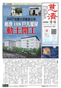 本刊採 FSC 認證標章用紙,為環境永續盡一分心力! 全球焦點 1 【靜思語】 真正的愛心,是照顧好自己的這顆心。 服務專線:03-8266779 分機 542、547 慈濟週報 花蓮訊 / ○ 四 ○ 三花蓮 月,終於 縣府提供土地 濟大愛屋,動土 慈濟基金會執行長顏 典禮上,證嚴上人透過 期待和祝賀,並表示花蓮 幸能為花蓮這片土地盡一分心 援建工程,期待善的種子深植在 生生不息。現場洋溢的歡喜之情,讓 美好向前的希望。 ﹁明年等大愛屋蓋好,要不要跟阿公一起搬 啊?﹂登記入住大愛屋的受災鄉親吳聲輝,說 牽著小孫女的手,散步到工地關心進度。他很關 的進度,笑說:﹁我真的每天照三餐來看,一天看三 次!﹂吳聲輝一家十口、三代同堂,地震後住了三天飯 店,接著入住教會近一個月,之後租屋而居。七月份家 裡又誕生了一個小嬰兒,於今看到大愛屋正式啟建,他 說:﹁實在好高興,因為至少可以安定兩年,且有這麼 多人一起幫助我們,自己一定會振作,並希望一起帶動 受災鄉親向前努力。 慈濟興建的五層樓集合式住宅將作為兩年安置的中 繼屋,可提供套房一百一十二間,雙房卅二間,總共有 一百四十四間。慈濟基金會執行長顏博文表示,﹁上人 在第一時間就想蓋永久屋。﹂上人希望能為鄉親興建堅 固的建築,讓鄉親在等待家屋完成的期間 能夠有一個 安心的居所,才能讓心好好安住為將來努力。 讓受困的人家有一個安心的居所,慈濟早在一九六七 年,佛教慈濟功德會草創初期,就為八十一歲獨居照顧 戶李阿拋老先生在花蓮興建一座空心磚水泥砌、覆蓋鐵 皮、佔地五坪的房舍,土地由花蓮熱心人士張榮華捐 贈。當時師父們縮衣節食籌措了六千餘元工程費,不忍 眼盲老先生,獨居茅草搭建、四壁破損不堪的屋子,自 己摸索生火煮食。證嚴上人親往探視後,顧不得經費拮 据的窘迫,決定為 屋。同年十二月十五 日,首間慈濟屋落成 老先生歡喜入住,在此安享晚年。 之後 這間愛心搭建的屋子接續入住了廖火本等多位獨 居老人家。 (圖 /文:慈濟基金會) 慈濟 108 戶大愛屋 動土開工 慈濟基金會與花蓮縣府已於六月二日簽立合 作契約,由縣府提供花蓮市廣東街與信義街口的土地, 慈濟基金會出資興建五層樓集合式住宅,社區內規劃社區中心、汽 機車停車位、電梯等。臨近交通生活機能便利。(大愛屋示意圖) ▲ 一九六七年十一月 一日,證嚴上人為李 阿拋老先生建房主持 動土儀式。當時吉安 火車站站長張榮華捐 贈了在花東公路邊的 一塊土地以供建屋。 ▲ 證嚴上人不忍眼 盲的李阿拋老先生 住在花蓮木瓜溪床 上的茅草屋,還要 自己生火煮食,決 定為他興建一處安 全的住所。 地震災民翹首以待