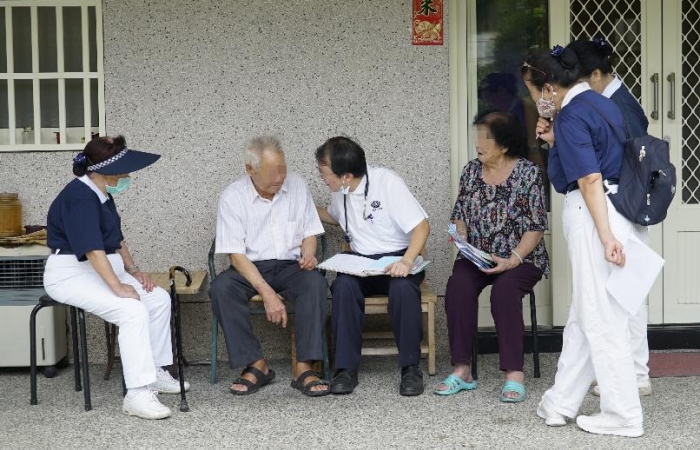 脊椎開刀的黃阿公,李永磐醫師(右三)一邊檢查他的用藥情形,一邊安慰著辛苦照料他的另一半黃阿嬤。(攝影者:留榮松,地點:臺中新社,日期:2020/09/27)(文:李寶美、康錦蓉 臺中報導 2020/10/06)