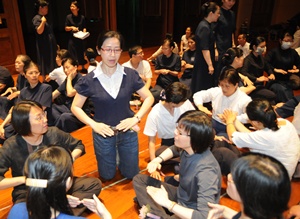 2011年八月六日起,高雄漢神小巨蛋即將舉行三場經藏演繹活動,近一個月來,高雄區志工密集地在各個社區進行手語、妙音的共修活動。全場學員動作整齊畫一,和先前的慌亂無措形成強烈對比。(攝影者:陳俊宏,地點:高雄靜思堂,日期: 2011/04/22) 四區共修 動線走位演練