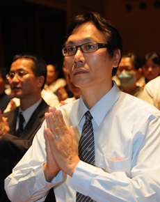 來回幾次的練習,漸入狀況後,台上、台下隨之配合音樂做練習,當「生生世世都在菩提中」的音樂響起,站在前頭居動線領導位置的陳俊宏師兄秉氣凝神地聽的歌詞,當唱誦至「立願覺悟……」時,他馬上踏出右腳往前行進,後面的隊伍也精準確實地跟著緩緩移動,全場學員動作整齊畫一,跟之前慌亂無措形成強烈對比。