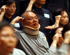 曾參與過《無量義經》巡迴演出的慈濟人醫會醫師紀邦杰,也參與此次演繹集訓,頸部圍著護頸套的他在隊伍中顯得很突出。紀醫師也暫時放下自己開設的診所來到花蓮,希望把這幾天的集訓當作是在共修。