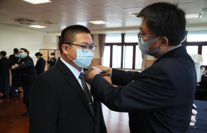 受證前許益國,心情相當喜悅與興奮的接受師兄幫他別上胸花。(攝影者:李清壽,地點:新店靜思堂,日期:2020/11/30)