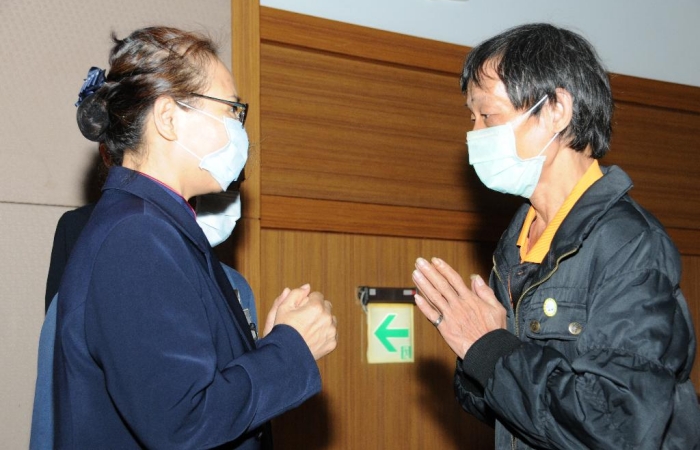 張金民先生(右一),除了受邀參加慈濟年終歲末祝福,還親自為往生的女友向志工們道謝。過去因為有志工的陪伴,女友才得以有機會為人群服務。(攝影者:許載福,地點:臺中靜思堂,日期:2020/12/12)