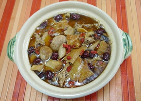 4. 再加入杏包菇炒香,加入麵鴨.猴頭菇.紅棗.枸杞。