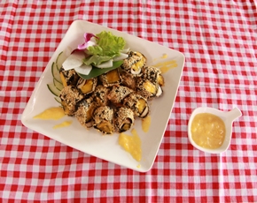4、杏鮑菇沾裹沙拉和素鬆,再用竹籤,將杏鮑菇、青椒、豆干串起來即可。