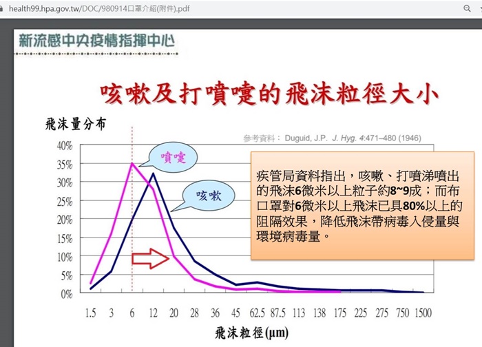 1. 咳嗽、打噴嚏所噴出的飛沫中,六微米以上的粒子佔了約八到九成。