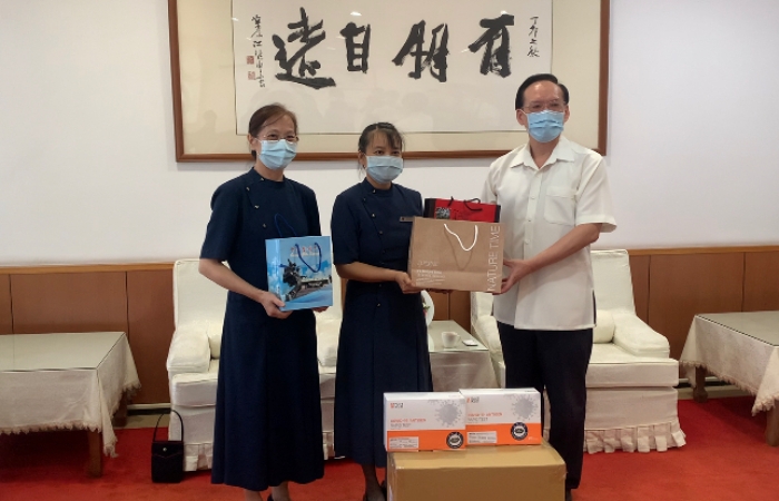中央警察大學主任秘書霍春亨代表校方接受慈濟捐贈,並回贈紀念品。(照片:中央警察大學提供)防疫是每一個人的事,守護第一線人員的安全,慈濟基金會責無旁貸。五月份全臺疫情升溫後,慈濟陸續提供多個縣市政府及警消單位防疫物資;此外,也陸續提供弱勢家庭安心生活箱、健康蔬果箱,並出借二十多處靜思堂作為社區疫苗接種站。