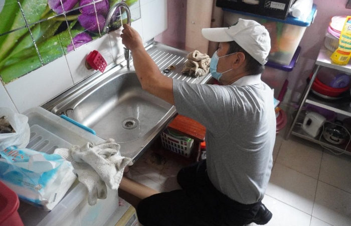 夫妻倆在慈濟十多年,林金聲多次參與照顧戶居家打掃活動,經驗豐富,抵達現場就知道從哪裡開始著手。他也參加過多次的海外義診,對水電工駕輕就熟,此次還負責拆卸和替換羅哈娜廚房的水龍頭,讓羅哈娜歡喜萬分。