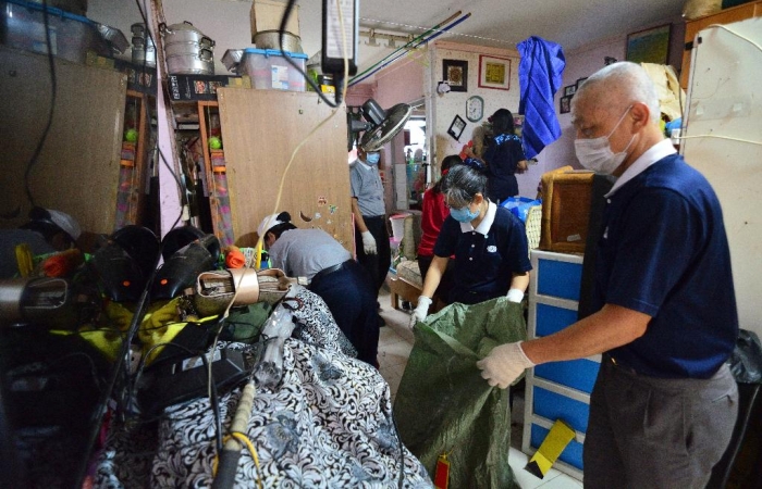 組屋內囤積物繁多,慈濟團隊事前與市鎮理事會聯絡,要求提供大型回收桶和垃圾桶,並派員工前來將丟棄的大件物品搬走。