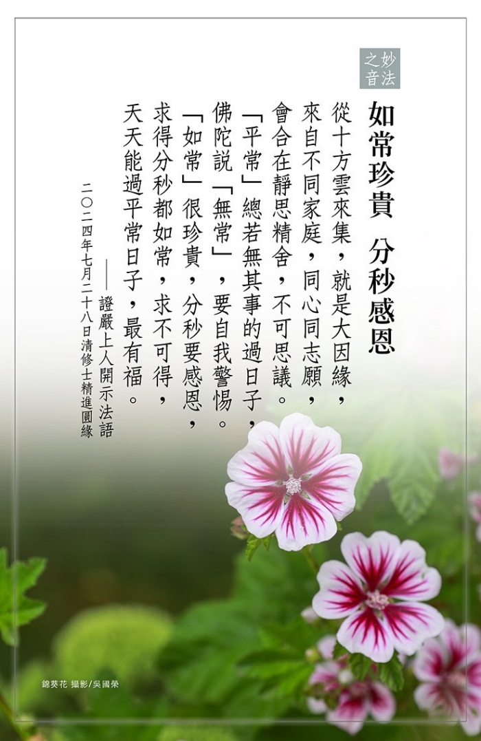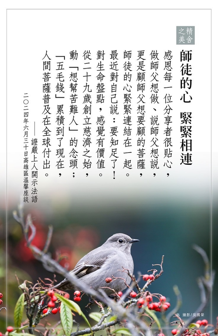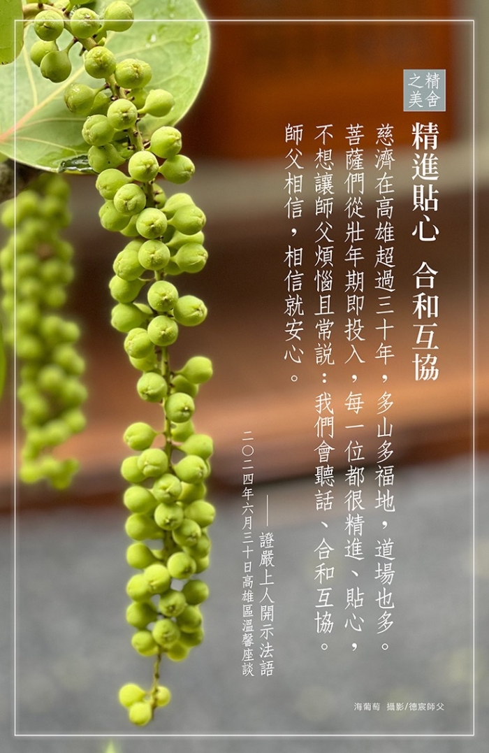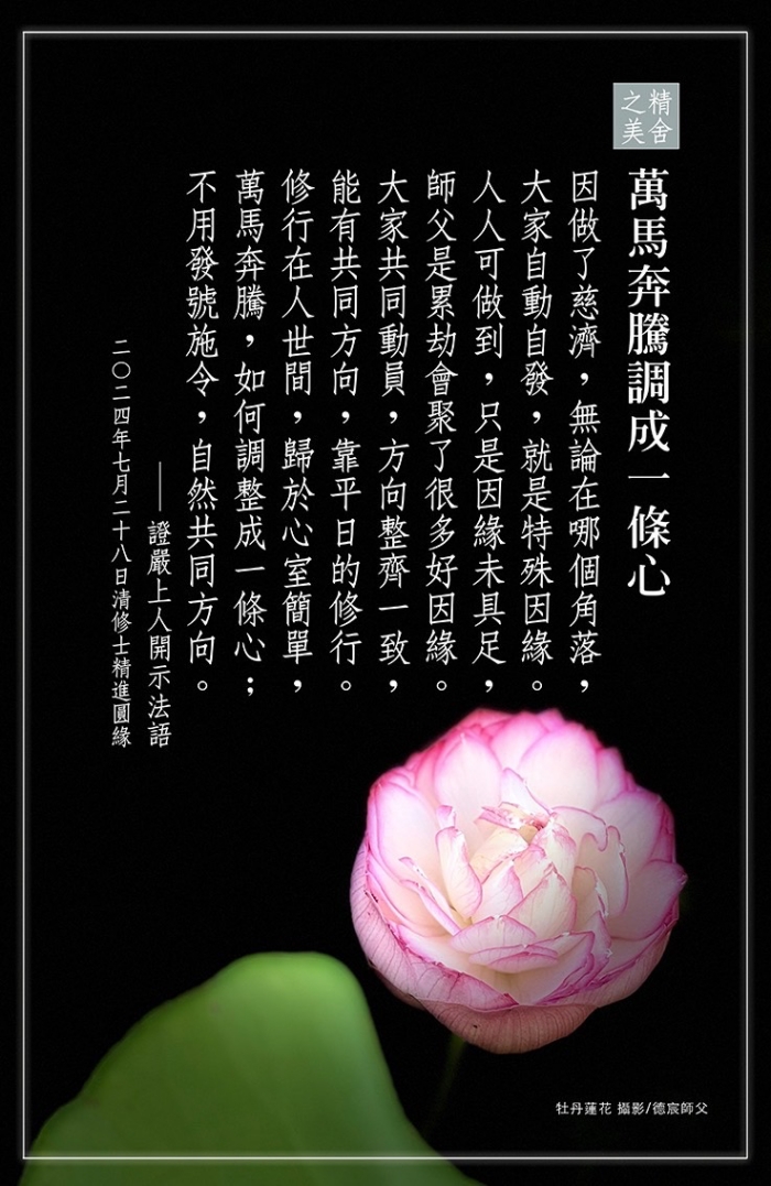 這一波的疫情,讓大家總是『停、聽、看』,才能平安。現在社會生活匆匆忙忙,要整個家庭都在家裡很難,這一波讓人人有家聚的機會,所以盡量在家裡不要往外跑。我們現在大哉教育,身心修練一下,把心收回來,很自然一切就會降低、降溫,就不會有溫室效應升高,造成氣候變遷、人間多污染、感染。我們要轉知識成智慧,何況是在一念間絲毫的偏差。所以要顧好一念心,把心戒定慧,而且要時時啟發自己的信願行。戒定慧、信願行,若能夠常常這樣平衡,我們就是六度萬行——救自己、度別人,可以救天下。 ——證嚴上人開示