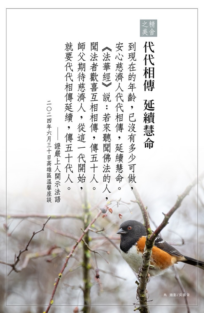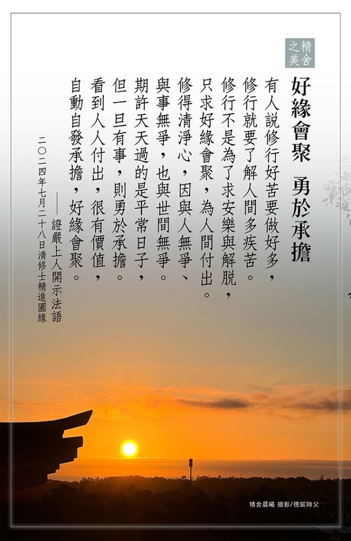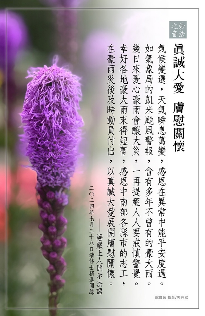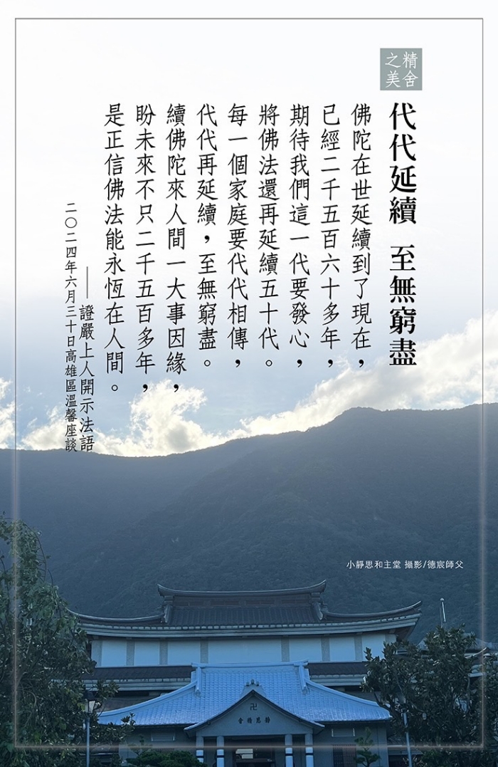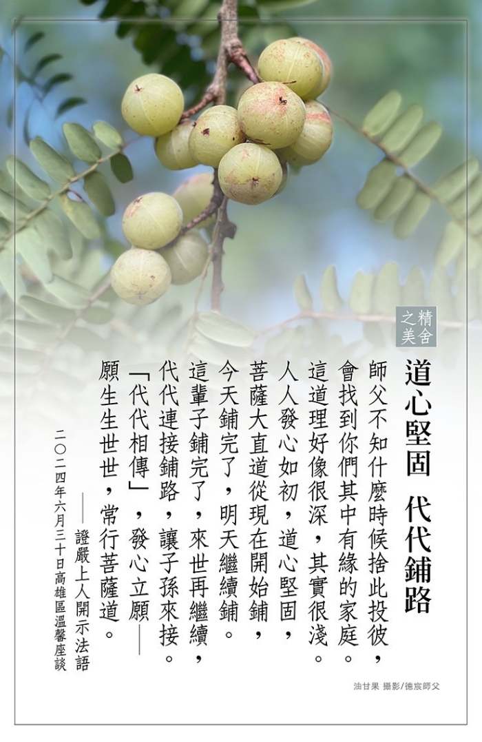 這一波的疫情,讓大家總是『停、聽、看』,才能平安。現在社會生活匆匆忙忙,要整個家庭都在家裡很難,這一波讓人人有家聚的機會,所以盡量在家裡不要往外跑。我們現在大哉教育,身心修練一下,把心收回來,很自然一切就會降低、降溫,就不會有溫室效應升高,造成氣候變遷、人間多污染、感染。我們要轉知識成智慧,何況是在一念間絲毫的偏差。所以要顧好一念心,把心戒定慧,而且要時時啟發自己的信願行。戒定慧、信願行,若能夠常常這樣平衡,我們就是六度萬行——救自己、度別人,可以救天下。 ——證嚴上人開示