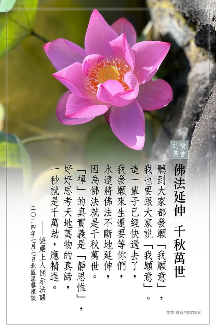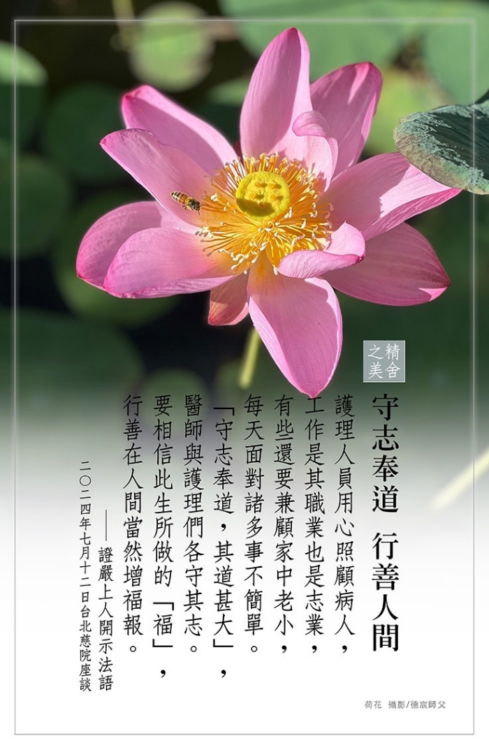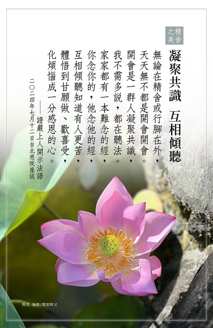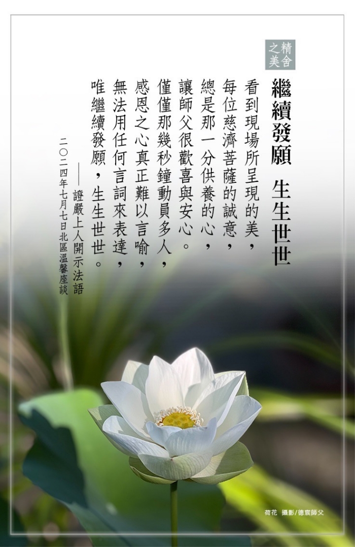 這一波的疫情,讓大家總是『停、聽、看』,才能平安。現在社會生活匆匆忙忙,要整個家庭都在家裡很難,這一波讓人人有家聚的機會,所以盡量在家裡不要往外跑。我們現在大哉教育,身心修練一下,把心收回來,很自然一切就會降低、降溫,就不會有溫室效應升高,造成氣候變遷、人間多污染、感染。我們要轉知識成智慧,何況是在一念間絲毫的偏差。所以要顧好一念心,把心戒定慧,而且要時時啟發自己的信願行。戒定慧、信願行,若能夠常常這樣平衡,我們就是六度萬行——救自己、度別人,可以救天下。 ——證嚴上人開示