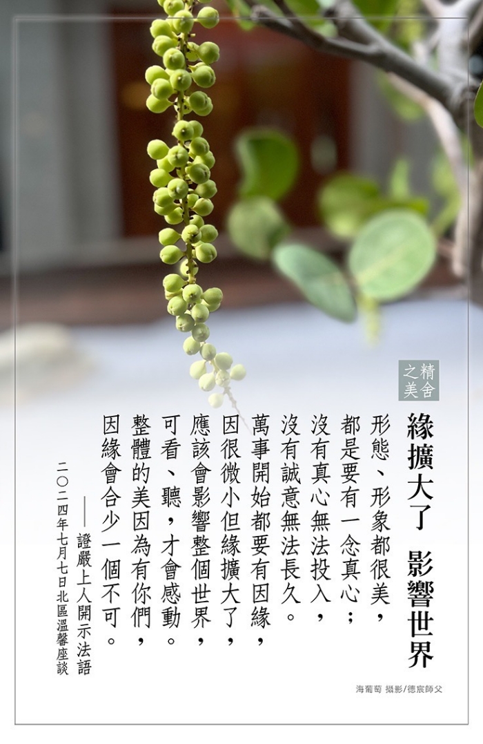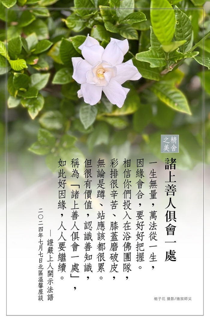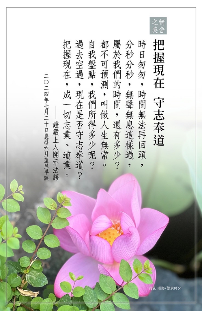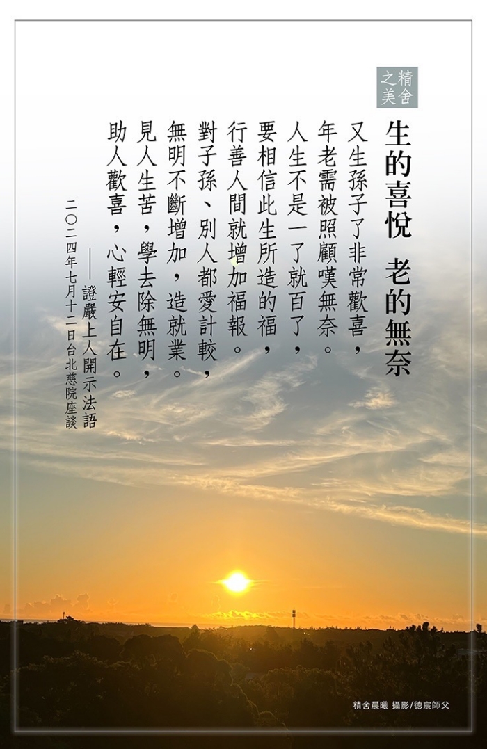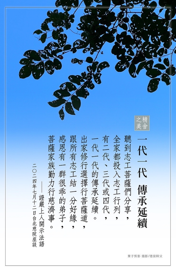 這一波的疫情,讓大家總是『停、聽、看』,才能平安。現在社會生活匆匆忙忙,要整個家庭都在家裡很難,這一波讓人人有家聚的機會,所以盡量在家裡不要往外跑。我們現在大哉教育,身心修練一下,把心收回來,很自然一切就會降低、降溫,就不會有溫室效應升高,造成氣候變遷、人間多污染、感染。我們要轉知識成智慧,何況是在一念間絲毫的偏差。所以要顧好一念心,把心戒定慧,而且要時時啟發自己的信願行。戒定慧、信願行,若能夠常常這樣平衡,我們就是六度萬行——救自己、度別人,可以救天下。 ——證嚴上人開示