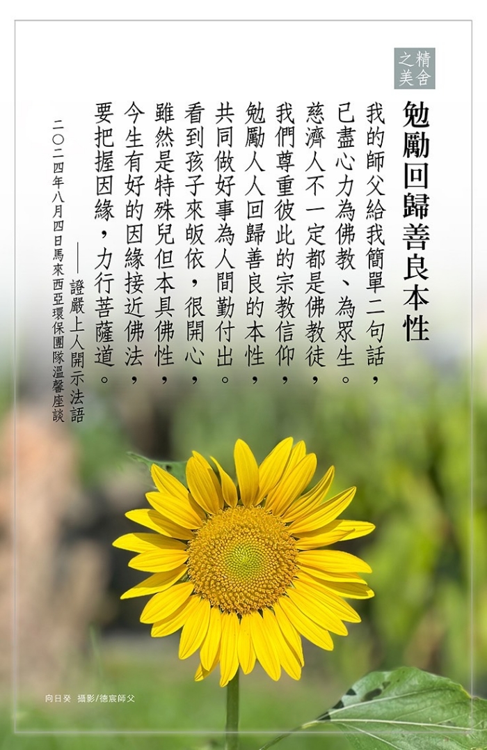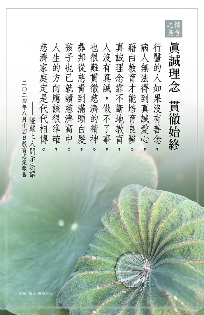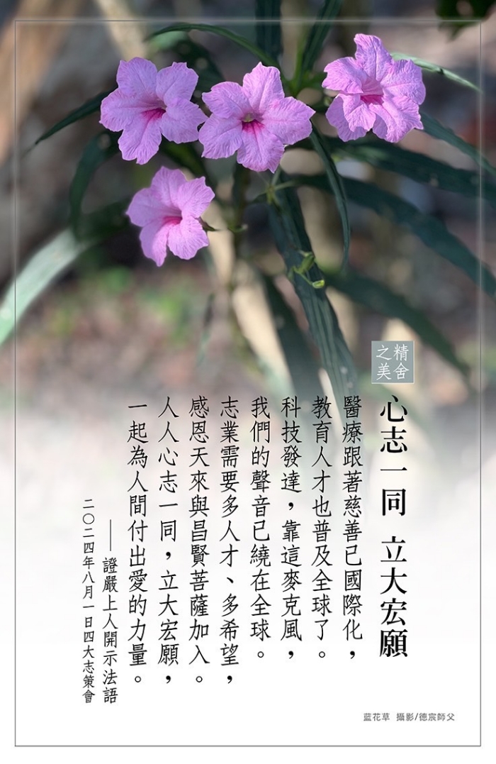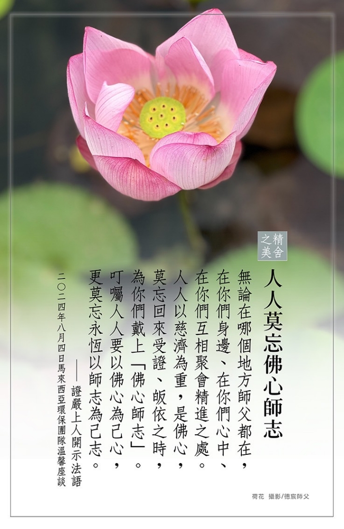 這一波的疫情,讓大家總是『停、聽、看』,才能平安。現在社會生活匆匆忙忙,要整個家庭都在家裡很難,這一波讓人人有家聚的機會,所以盡量在家裡不要往外跑。我們現在大哉教育,身心修練一下,把心收回來,很自然一切就會降低、降溫,就不會有溫室效應升高,造成氣候變遷、人間多污染、感染。我們要轉知識成智慧,何況是在一念間絲毫的偏差。所以要顧好一念心,把心戒定慧,而且要時時啟發自己的信願行。戒定慧、信願行,若能夠常常這樣平衡,我們就是六度萬行——救自己、度別人,可以救天下。 ——證嚴上人開示