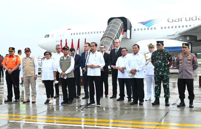 21日,印尼總統佐科威(Joko Widodo)在雅加達哈利姆•珀達納庫蘇馬國際機場(Bandara Halim Perdanakusuma),為賑災物資進行啟運儀式。印尼人類發展與文化統籌部長穆哈吉爾•埃芬迪(Muhadjir Effendy)、國防部長普拉博沃•蘇比安托(Prabowo Subianto)、外交部長蕾特諾•馬爾蘇迪(Retno Marsudi)、內閣秘書普拉莫諾•亞貢(Pramono Anung)、國軍總司令尤多•馬戈諾(Yudo Margono)、國家警察總長里斯提約(Listyo Sigit Prabowo)、國家救災機構主任蘇哈里延托(Suharyanto)、國家災害救援機構負責人亨利(Henri Alfiandi)等也陪同出席。