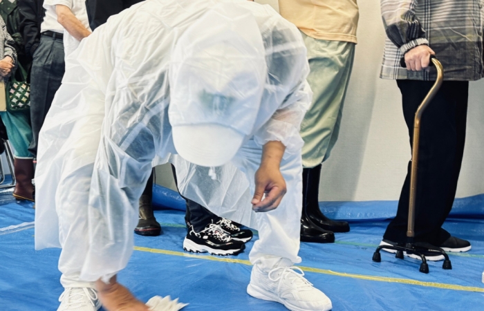 輪島神轎燈柱會館見舞金發放場地,因為地震之故,地面有許多裂縫及高低落差,前來領取見舞金的鄉親大多數為年長者,志工在引導動線設計考量上更加謹慎。對於每位前來的鄉親,志工都親自奉上熱茶、鳳梨酥和平安吊飾,並把握機會給予關懷、給予鼓舞。