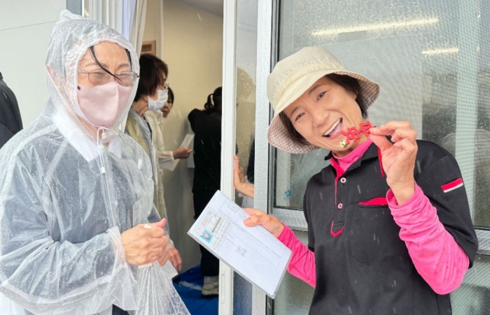 住在門前町的鄉親一森女士,看見志工們在大雨中為鄉親服務,既感動又心疼。於是她送來一箱仙貝當作慰問禮物,以此感謝志工們為鄉親的付出。