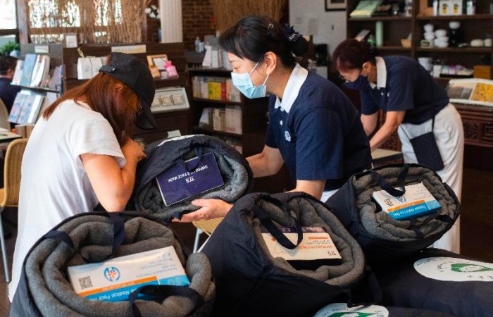 志工蔣珊珊難掩低落的心情,難過地說,「我們的福州志工一直陪同照顧奶奶,悉心幫奶奶挑棉被,並幫忙整理送她的許多物資,奶奶非常感動,才停止落淚。」