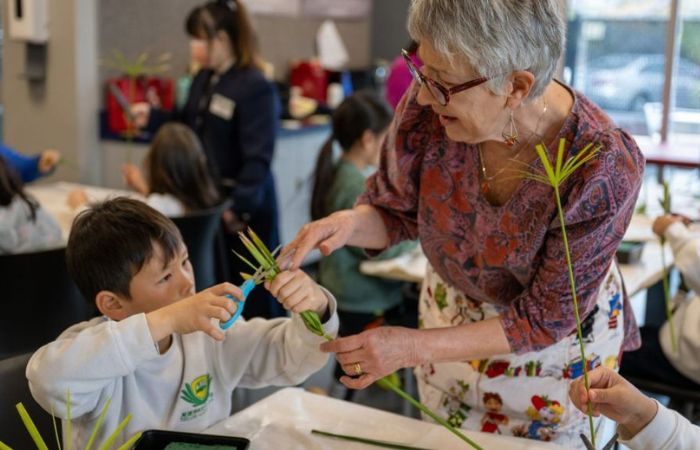 學習插花多年的克絲汀,受到人文學校邀請,帶領一到六年級的學生們學習插花。每個人對花草有不同的感受,而克絲汀從中看到學生自由創意的揮灑,也對從自然土地上所取得的資源,產生感恩之心。