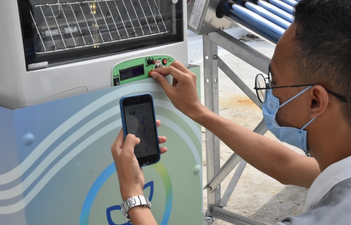 行銷與流通管理系三年級印尼籍學生何強豪說明, SHINERGY採用太陽熱能為乾燥的能源,再搭配最夯的物聯網概念,希望能吸引農民合作社青睞。當太陽熱能被真空管集熱系統吸收後,熱空氣將被引導至乾燥箱,農產品就可被烘乾。甚至,再搭配太陽能板,進一步提供綠色電力,讓乾燥機的數據可連動至物聯網,讓農民在手機端,就能隨時掌握機器的運作狀況。