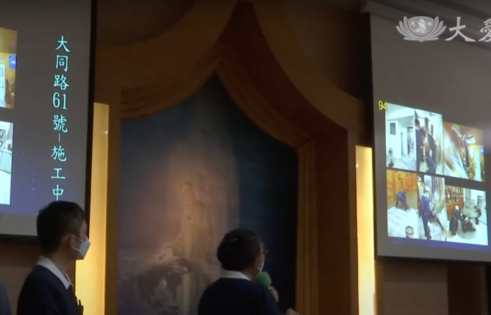 證嚴上人開示:「我看到他們也在塗水泥, 看他們真正地蹲在地上, 我都是一直看到不簡單,很感動,大丈夫能縮能伸,平安的地方,哪裡有災,我們就往哪裡去幫助,而且安心、安生活。」