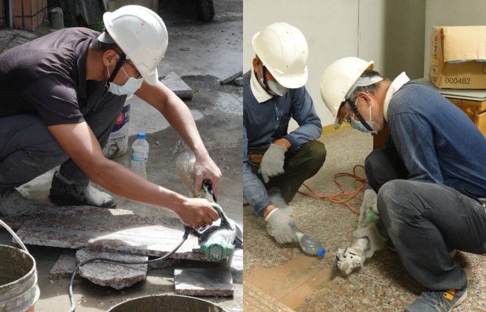 客廳裡,吳金定操作切石機切割破裂的地磚,許自發拿著寶特瓶在一旁澆水降溫。隨後就是打除地磚,花崗石地磚很有厚度又堅硬,必須緊握電動錘與之奮戰,相當費力,手痠了,就換手。吳金定的背部早已被汗水浸透。