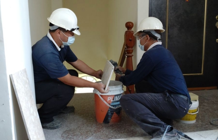 28歲的吳博皓跟著父親學習泥作已有六、七年,來到玉里,父子倆合作無間,大面積的打底、大塊磁磚的黏貼,都由吳金定操刀;小塊磁磚掉落的修繕,就由吳博皓處理。吳博皓說,參與修繕,雖然也很辛苦,但最辛苦的是在外住宿不習慣,睡不好,「要來之前有些猶豫,還是來了,因為有人需要幫忙。」