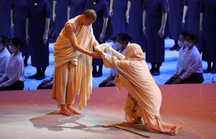 當〈爐香讚〉樂音起,「優人神鼓」雙手合十,與1千680位演繹志工緩緩步入舞臺,莊嚴會場,宛如菩薩親臨。「唐美雲歌仔劇團」,透過肢體動作,演繹〈佛陀的足跡〉;鑼鼓齊鳴,「優人神鼓」演繹佛陀入〈苦林修行〉。而《無量義經》的〈德行品〉、〈說法品〉、〈功德品〉經文,也與慈濟四大八法,以事印證,透過舞臺藝術如實呈現。在過程之中,但見在現今故事演繹之時,舞臺的大型銀幕,也映出了當時的真實畫面,足跡翩翩,⋯⋯