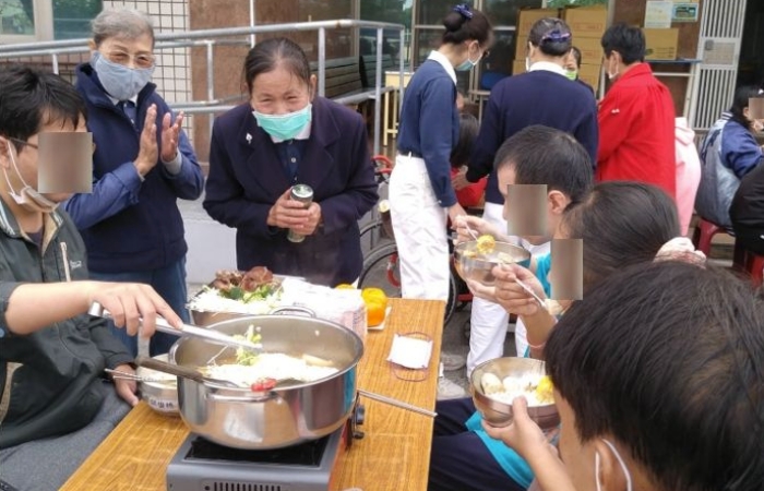 火鍋之外,志工還烹煮美味的素食佳餚,當佳餚上桌,住民們聞香而至,機構的前庭廣場,在蒸騰的熱氣和美食的香氣中,還洋溢著住民們的開心笑容。