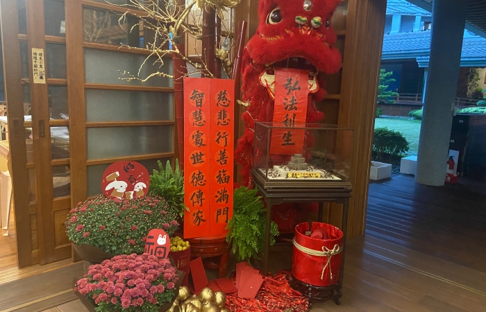 恭恭敬敬送舊迎新一點一滴也在精舍的人文布置中。鮮花、吉祥兔、2023年新春對聯——「慈悲行善福滿門、智慧處世德傳家。」當然,攀爬須彌山的小螞蟻也不缺席,象徵「過心年,精進如常。」