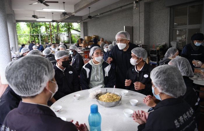 從加拿大回來的王耀明到各桌細細叮嚀慈科大外籍生,期望每個孩子好好感受臺灣人過年的心情。(攝影者:柏傳琦,地點:靜思精舍,日期:2023/01/20)