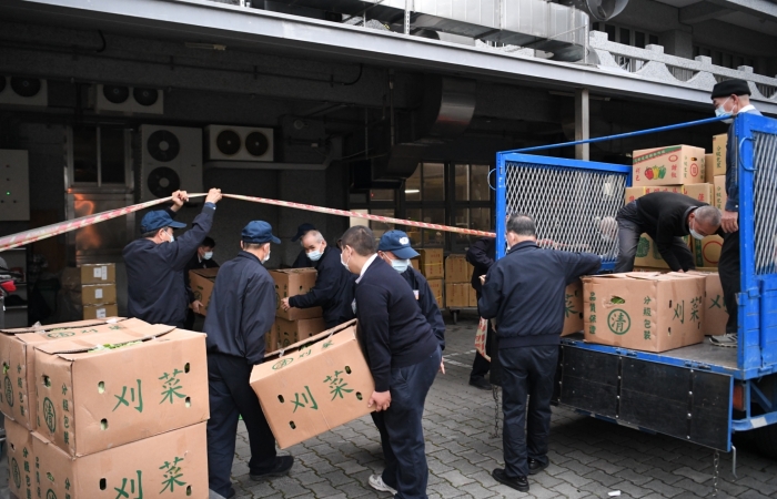 機動師兄看見貨車開進來,也立即動員協助搬運,合作無間。(拍攝者:柏傳琦,地點:靜思精舍,日期:2023/01/19)