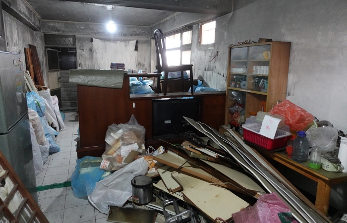 去年(2022年)12月底,北屯區一棟五層樓公寓起火,二樓火勢引發煙囪效應,濃煙竄升到五樓屋主潘女士住家,雖然火勢很快被撲滅,但見家的樑柱、牆面、家俱被燻的焦黑損毀,當時正逢農曆春節前夕,潘女士無力打掃整理,只能請求慈濟基金會協助。
