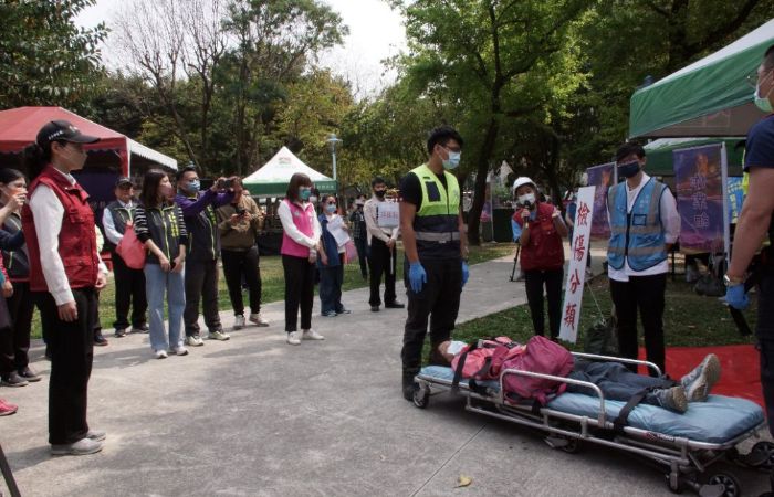 檢傷分類演練由雙和醫院擔任指揮官,分紅區、黃區、綠區,若災害發生,受傷人員能夠儘速送到合適的檢傷區。