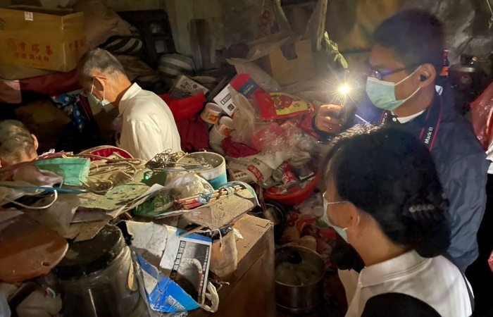 映入眼簾的是低矮破損不堪的老房子,再往前走幾步路,後方才是主要居住的地方,房子裡堆滿了比人高的雜物和垃圾。聽到李醫師呼喚,從裡面走出一位行動緩慢的老人家。