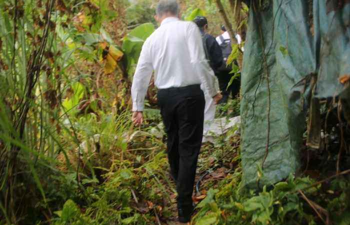 一行六人共乘一輛車,共同的一念心,備妥醫護箱上車,到了第一個往診住處。地處偏僻山區,將車停在山上的小路旁,李國正醫師熟門熟路沿著小路,拐了三個彎、爬坡而上。因為雨天路面濕滑難行,一路都是雜草叢生和落葉,還得壓低身體穿過樹枝,才能到張老先生的家。