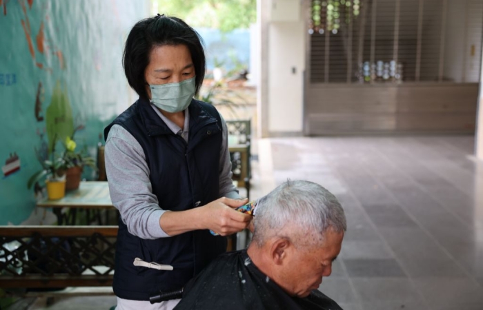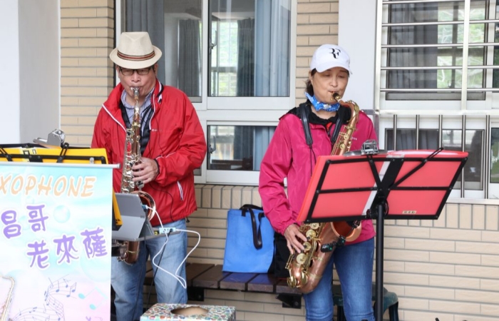 另外,定點義診服務則設在中和國小一樓跟二樓廊道,有一般科、眼科、中醫、牙醫等。每位來看診的長者,也都由志工一對一全程陪伴;現場還有志工免費幫長者剪頭髮,以及兩位音樂志工在現場以「薩克斯風」吹奏長輩們耳熟能詳的旋律。