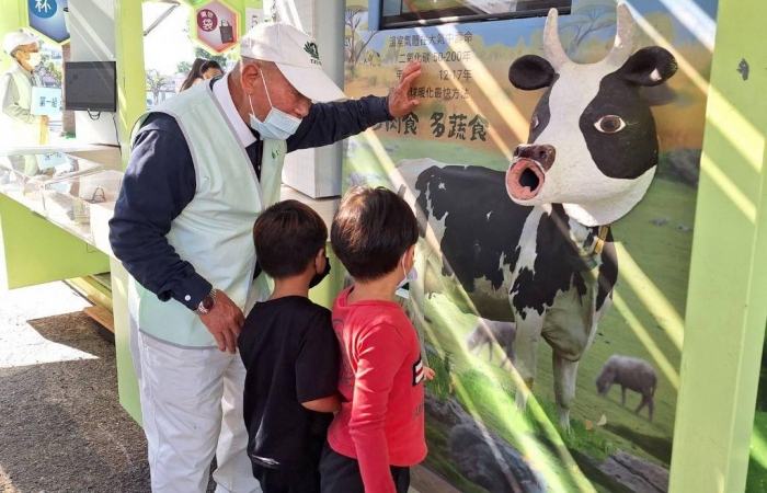 環保教育車進校園巡迴展,現年八十歲的慈濟志工莊盛雄,解說樂樂牛對環境的危害。(攝影:陳梅花)
