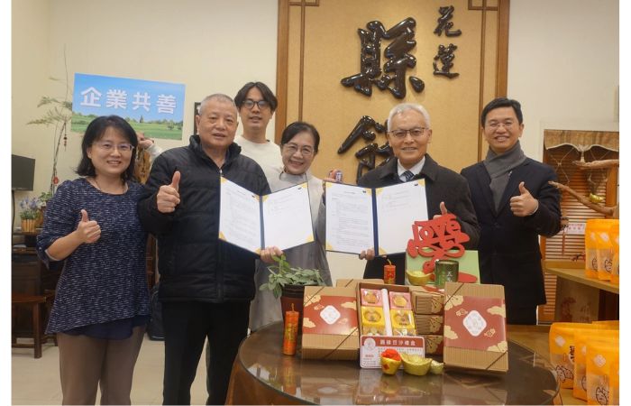 慈濟慈善事業基金會與曾獲台灣百大觀光特產的「花蓮縣餅」簽訂企業共善合作協議,花蓮縣餅將捐贈「圓緣豆沙禮盒」年度銷售所得盈餘的一成金額給慈濟慈善事業基金會,作為支持慈濟淨零碳排計畫。1月24日上午由慈濟慈善事業基金會副執行長張宗義、花蓮縣餅經理劉雅慈代表。