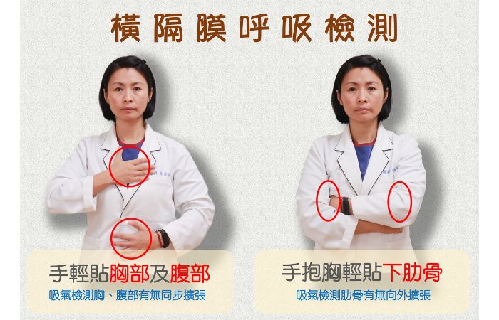 林秀玲說明橫膈膜式呼吸法的步驟,以坐姿穩固骨盆,上身保持中立,頭頂向上延伸,肩頸放鬆,雙手分別觸碰胸口及腹部,鼻子吸氣、嘴巴吐氣。標準是吸氣時胸腹同步鼓起,肺部擴張同時撐開肋骨,可以雙手交叉抱胸檢測,手掌輕貼兩側下肋骨,吸氣時感受肋骨是否膨脹,嘴巴不間斷慢慢吐氣,像似吹蠟燭,肺部內縮產生腹内壓,刺激腹橫肌、骨盆底肌等深層肌群,持續做能強化核心肌群,肺活量也會增加,還能為運動成效加分。