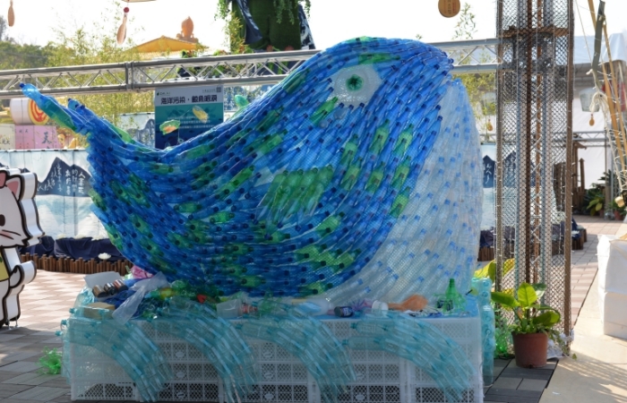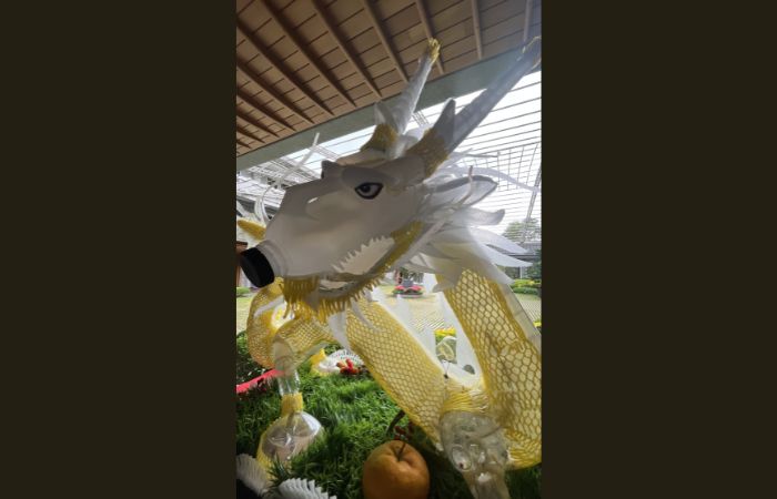 今年為龍年,在花蓮靜思精舍的中庭(慈悲廣場)迴廊前,擺設一隻利用環保回收物製作的祥龍花燈,是北投區志工陳政祥花了兩個半月時間,利用回收的大牛奶瓶、水果網袋、大小寶特瓶,以及禮盒包材等組裝拼貼而成,內部再置入變色LED燈,惟妙惟肖,栩栩如生。 迴廊的另一端,還有一隻紅色喜氣的祥龍,同樣是志工們發揮巧思的智慧結晶;它是利用舞龍的道具,以回收寶特瓶填充內部,塑造立挺的龍身,呈現龍年吉祥「好運攏攏來」。