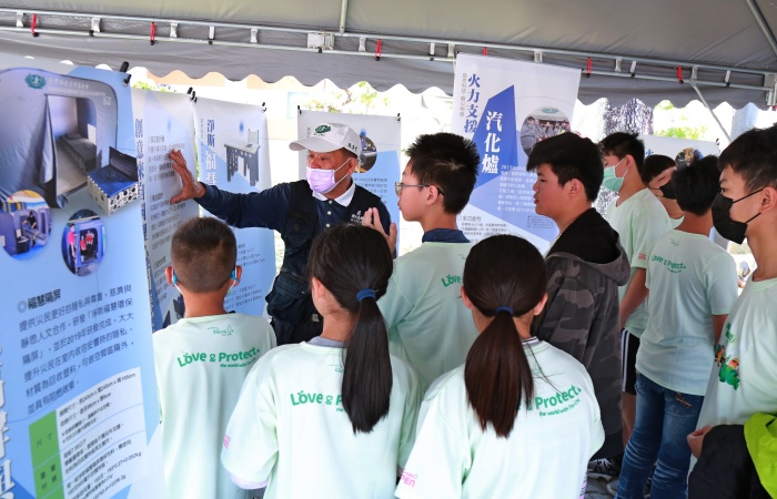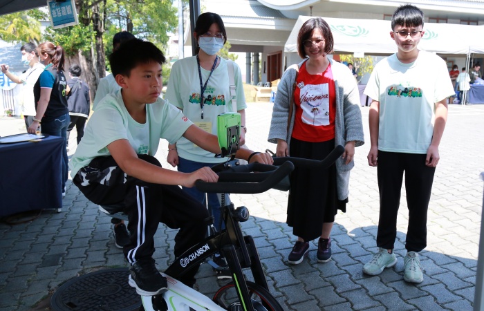 「加油……方向對了,衝!衝!衝!四格了,加油!」在「NEED FOR ESD」腳踏車充電攤位前加油聲不斷,陳品諺正用力踩著腳踏車發電,體悟可以用運動環保的方式去發電。他說:「減少二氧化碳的排放,降低溫室效應,阻止臭氧層愈破愈大,冰山不會融化那麼快。」腳踏車踩踏久腳也會酸,同時也讓學生體會平常吹冷氣、看電視等用愈多的電,就要消耗更多的力量,所以要節約能源,避免浪費地球資源製造汙染。